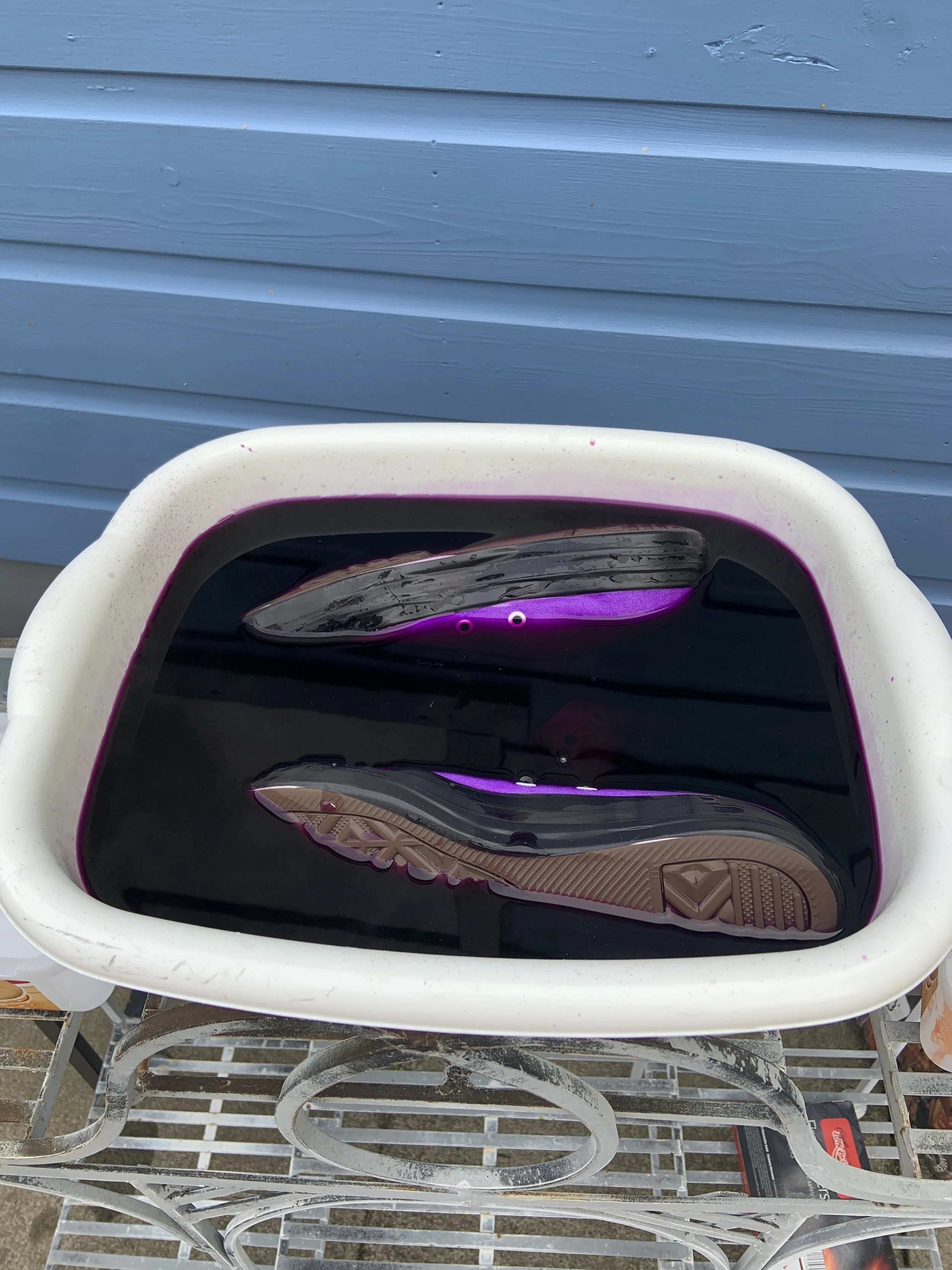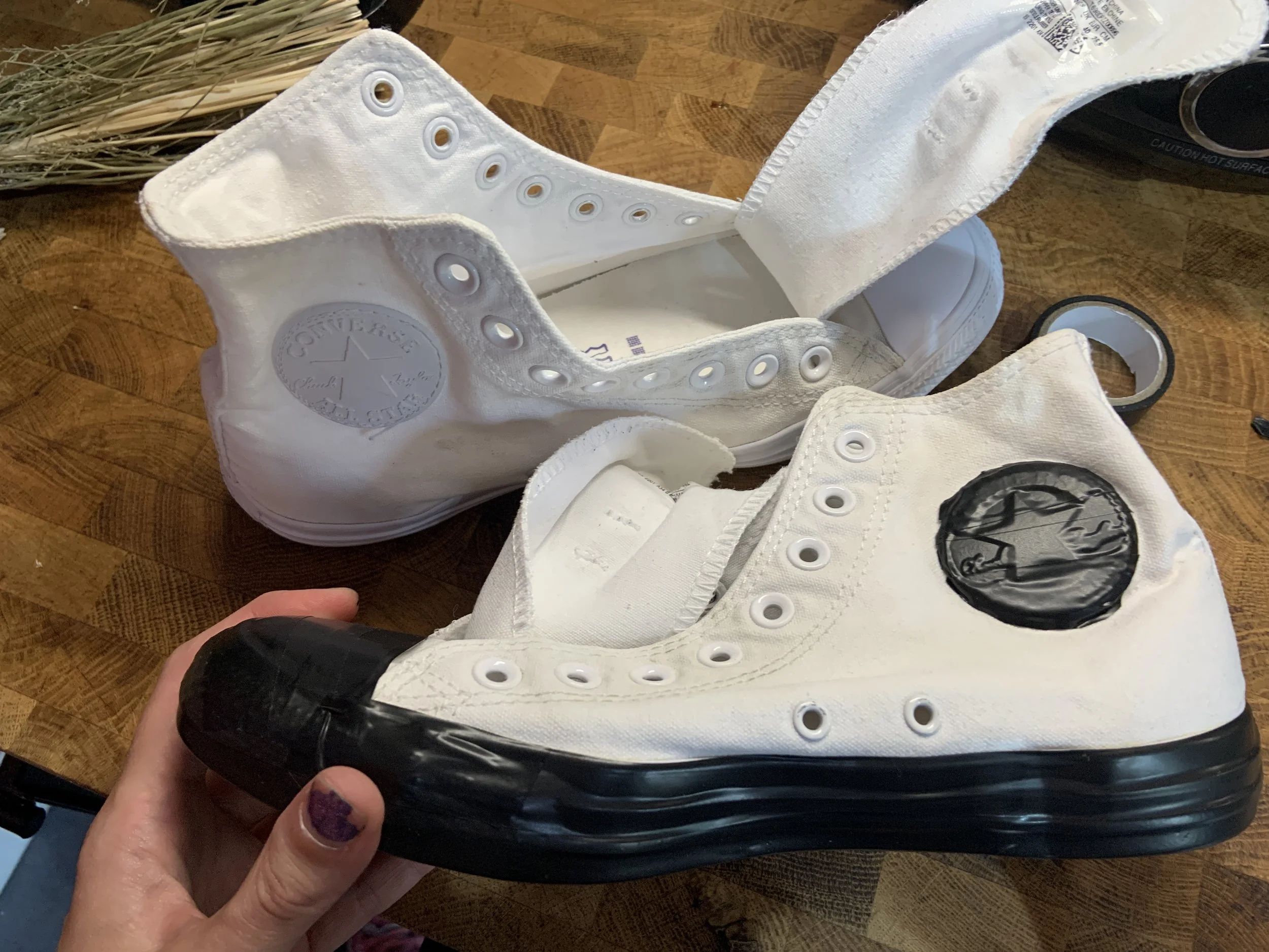 I got a cheap pair of nearly new white Converse from Vinted, for about £20. As my wedding dress is purple, I want them to match. The rubber parts of Converse do unfortunately stain, so I tried to minimise this by masking off the rubber parts with electrical tape.