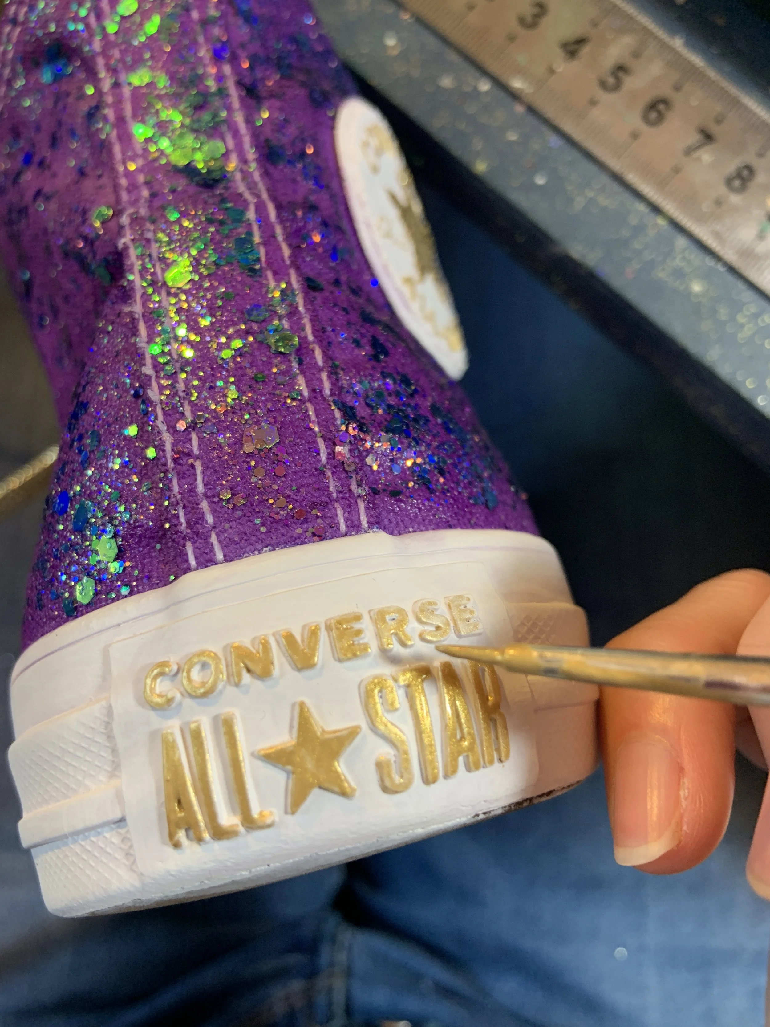Once the shoes are fully dry, remove the masking and get glittering! I chose a galaxy glitter from Etsy. Mix a decent amount of the glitter with Mod Podge and layer it on evenly.