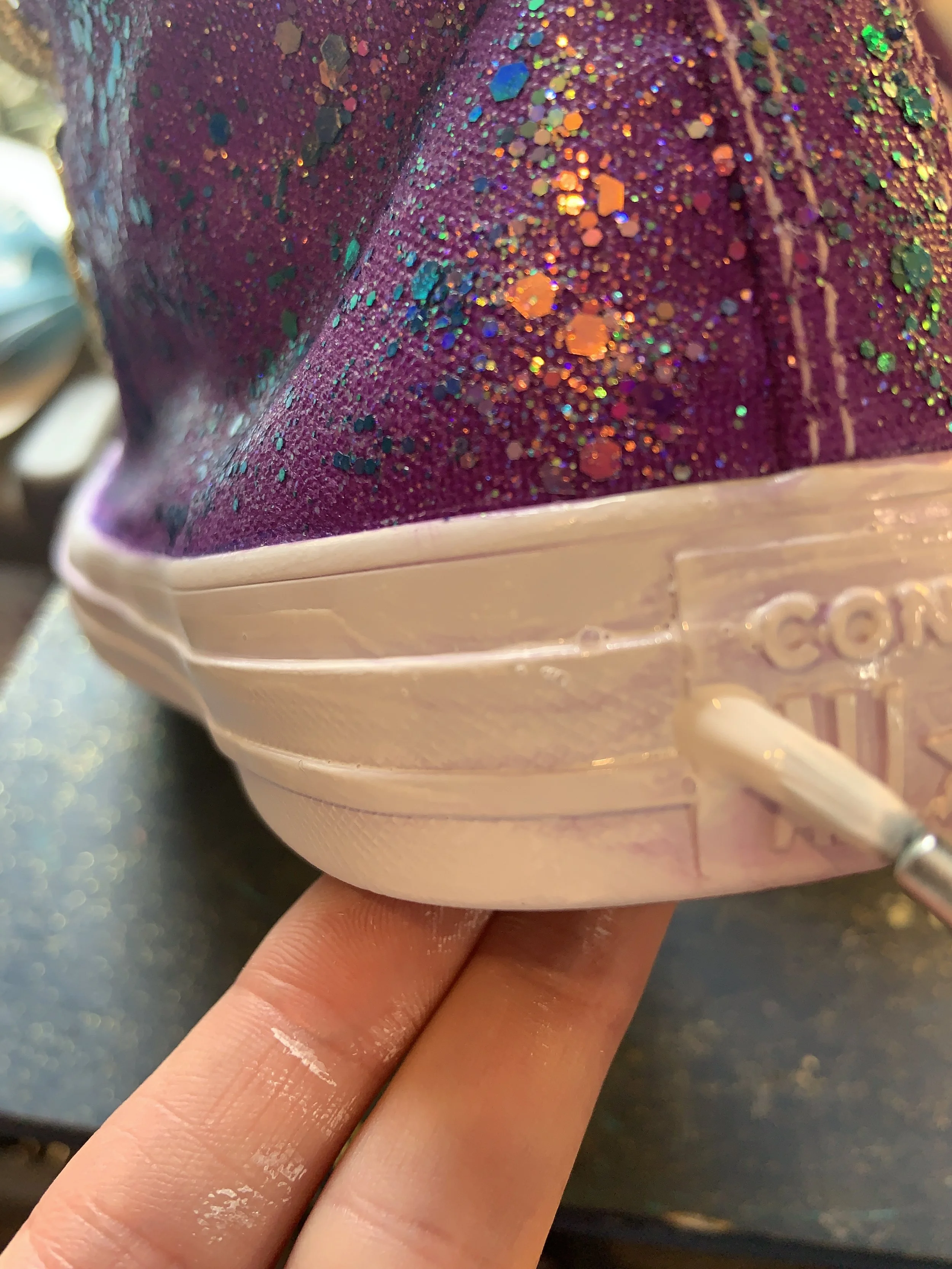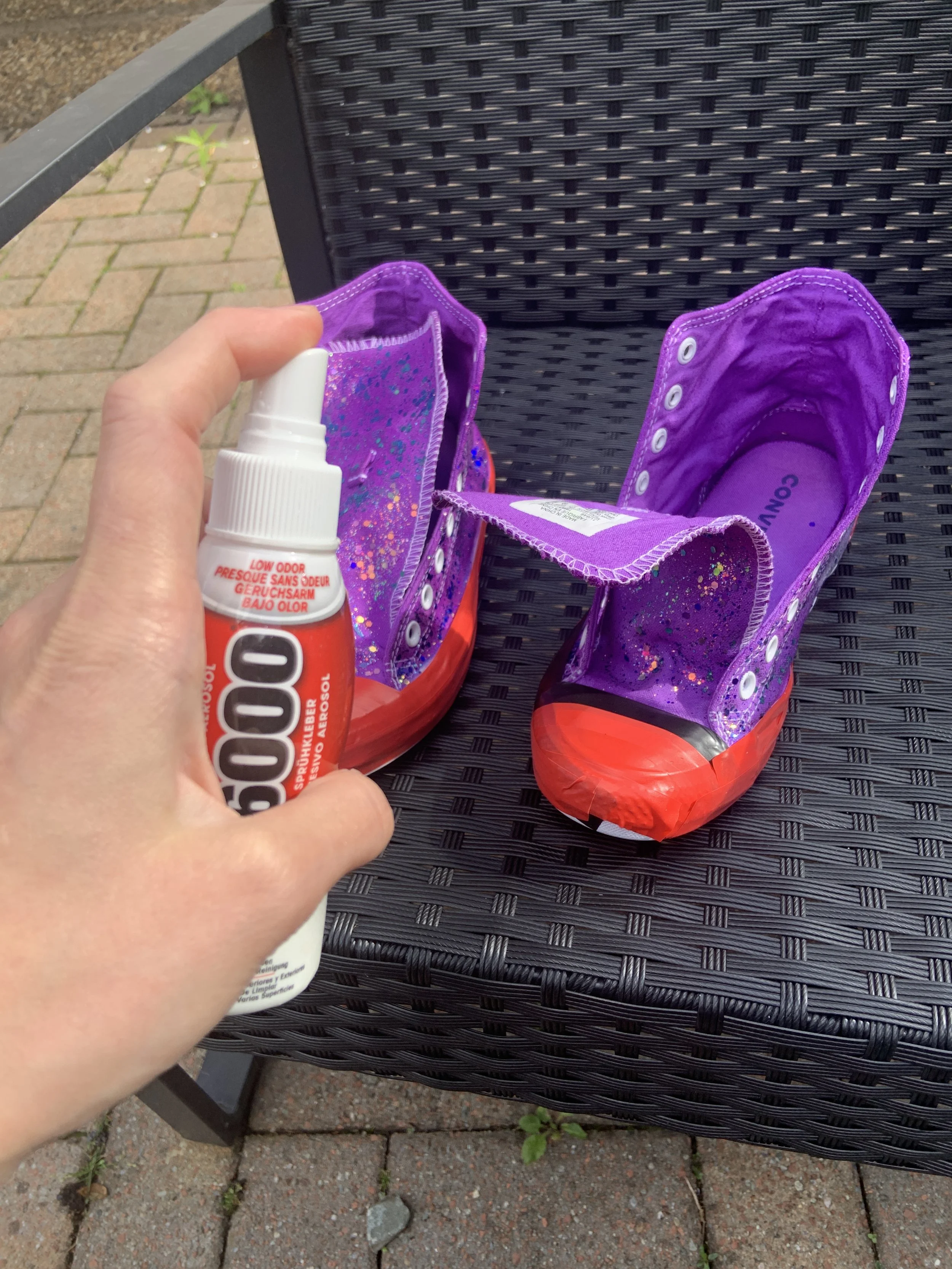 Once the glitter is dry, re-mask the rubber parts and spray the shoes with E6000 spray glue. This will seal the glitter and stop it flaking off.